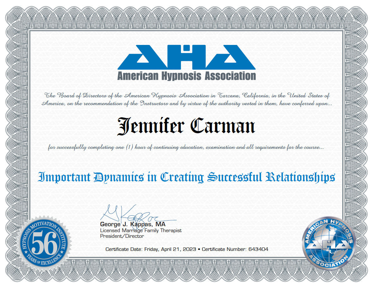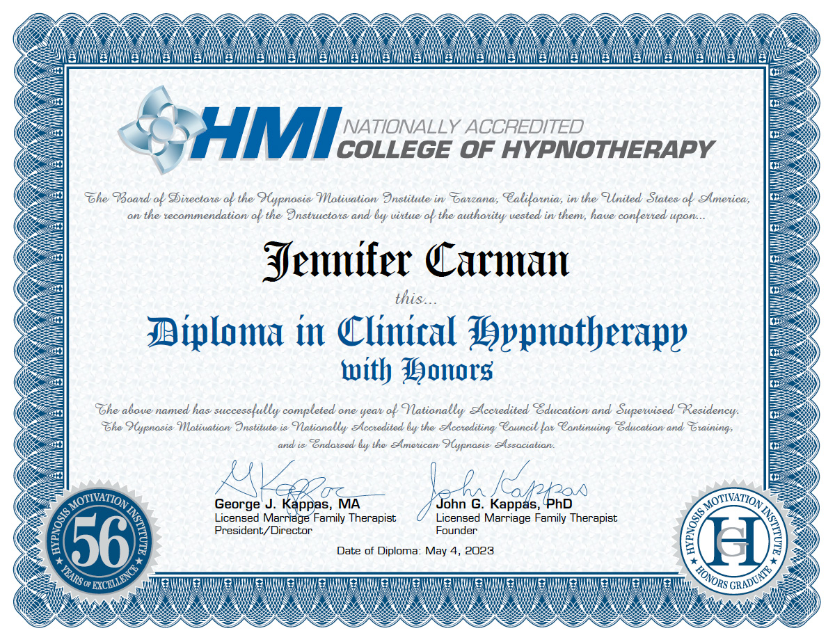 I have enjoyed a fantastic Mind/Body/Wellness career for over 20 years. My education spans from a pre-med degree in Exercise Physiology, a BS in Psychology, a Diploma in Clinical Hypnotherapy with HMI, training with some of the top Hypnotherapy mentors in the world, and helping to run a luxury spiritual retreat center in Ireland. I also incorporate my training as a Positive Parenting specialist and Relationship healer. I’ve had personal experience with hypnosis that changed my life in many ways, starting with a non-medicated natural home birth and, years later, a near-death tumor experience. I have traveled the world working with clients, teaching workshops, and pushing through my own personal obstacles to guide my clients into living fully for the rest of their lives. I’ve enjoyed publishing books and devoting my practice to personalized strategies with clients who love their results!