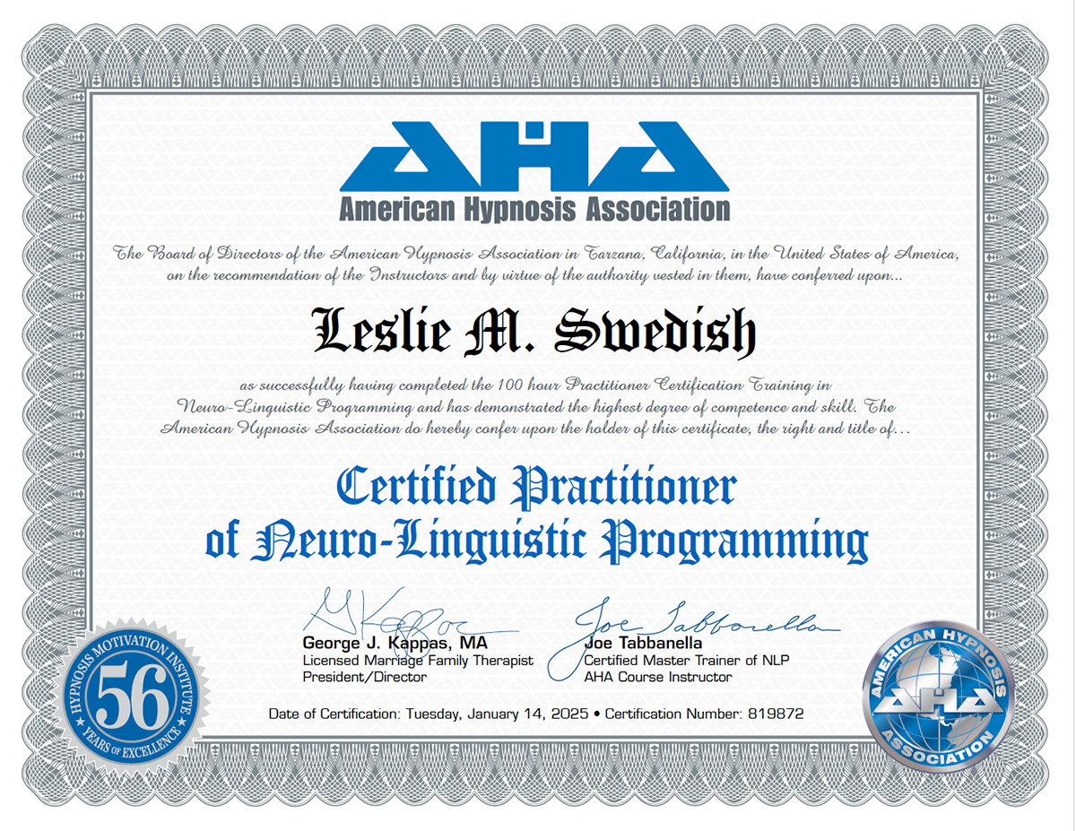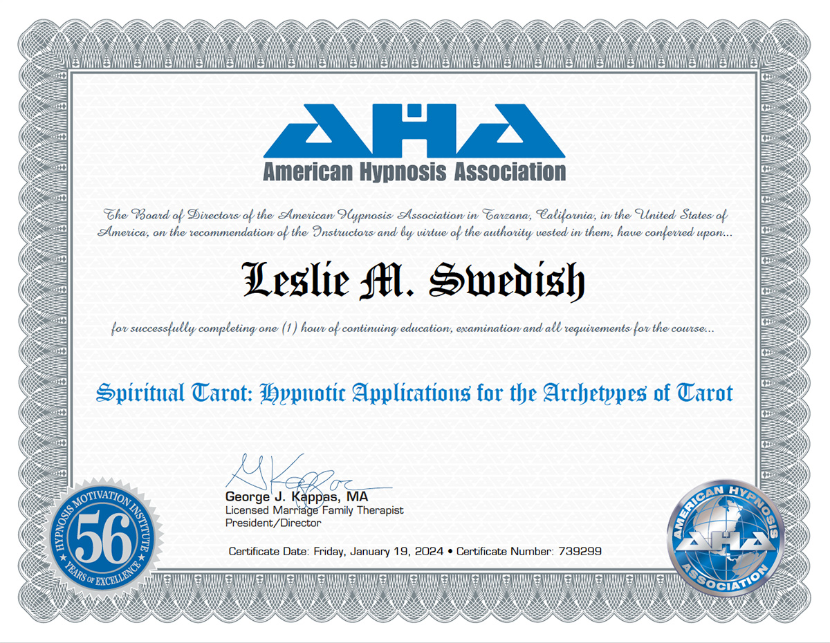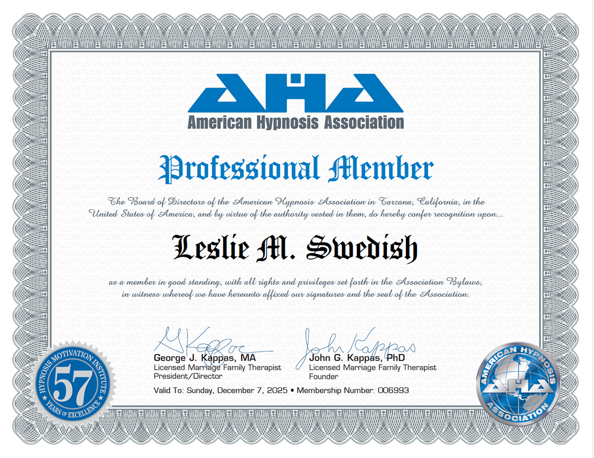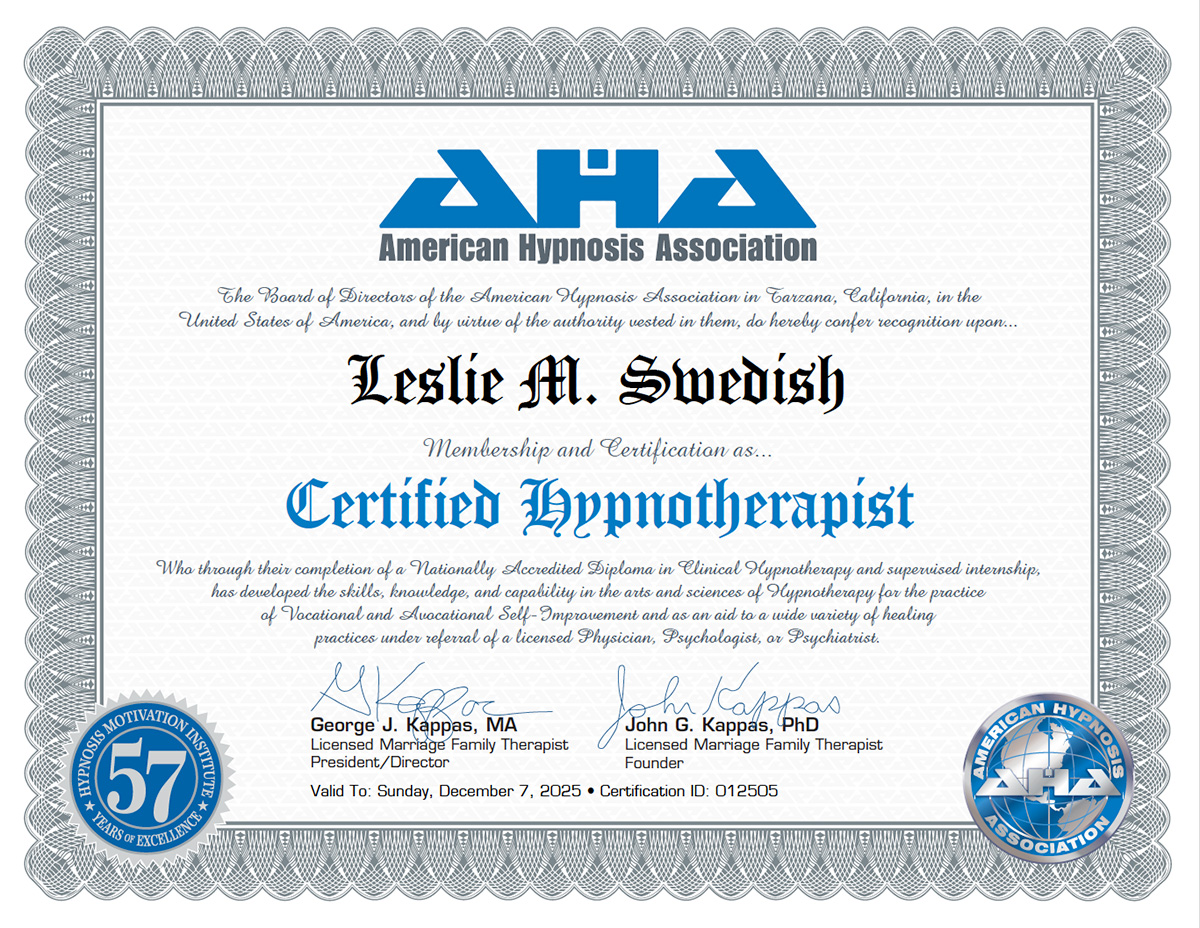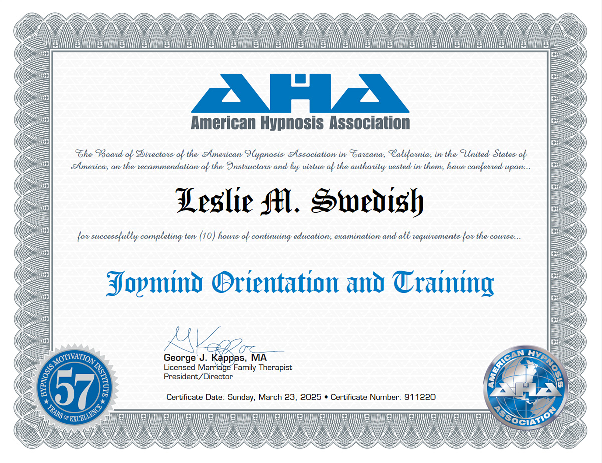Leslie specializes in helping clients heal from toxic relationships, overcome insomnia, resolve childhood trauma, and build confidence and motivation. She also supports those ready to quit smoking or vaping—empowering them to replace destructive habits with inner calm and self-mastery. Drawing from her certifications in NLP, Parts Work (IFS), Reiki, Chakra Healing, and intuitive modalities like Tarot and Oracle cards, Leslie blends structure and intuition seamlessly. Her background working with both analytical and spiritually inclined individuals allows her to meet clients exactly where they are—whether they approach hypnotherapy through science, spirituality, or simple curiosity.