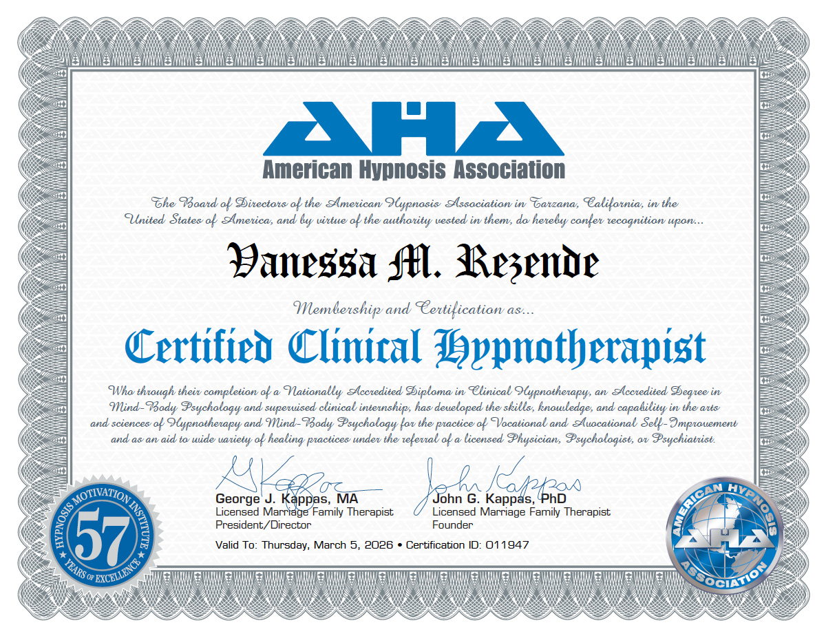 Vanessa M. Rezende is a Certified Clinical Hypnotherapist, Yoga Instructor, and Sound Healer with extensive experience in holistic wellness, mental health recovery, and mindset coaching. She specializes in stress and anxiety relief, weight loss, habit control, trauma recovery, pain management, confidence and motivation, integrating mindfulness practices and somatic therapeutic modalities to help clients lead healthier, more fulfilling lives.